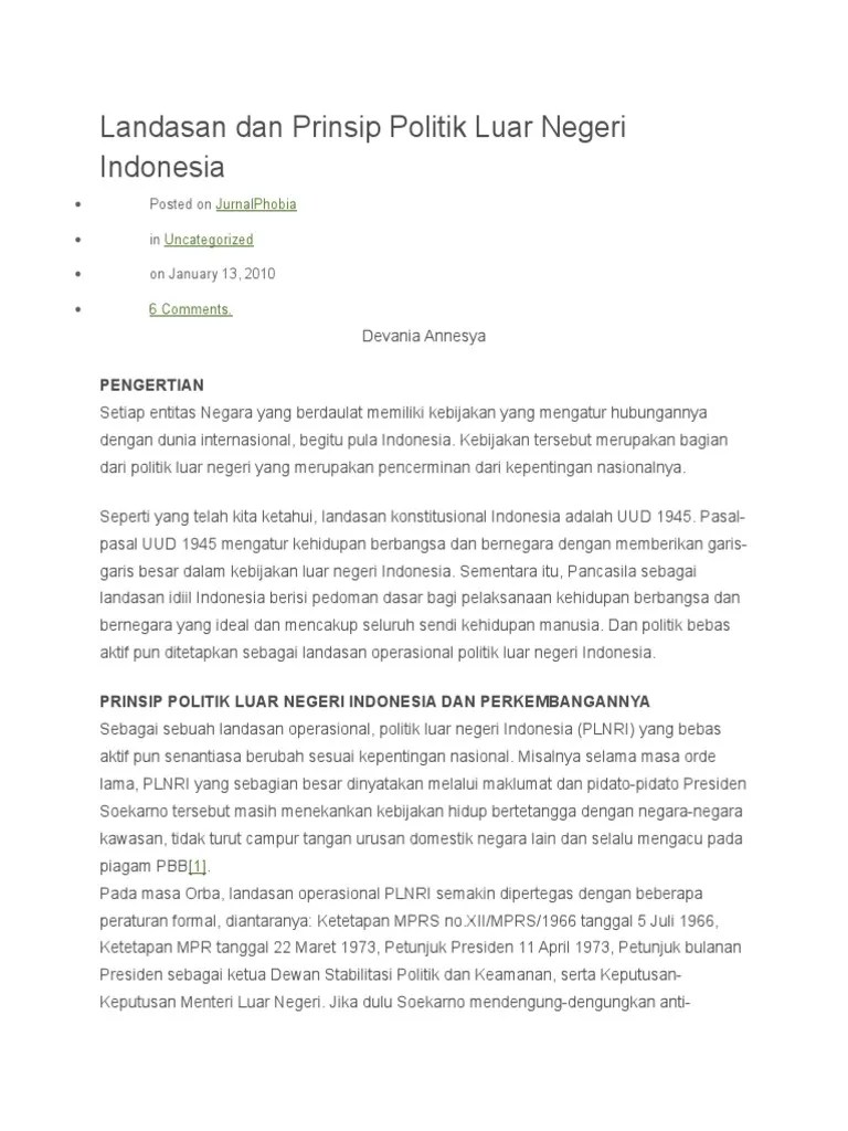 Contoh Makalah Idiil Dan Konstitusional Politik Luar Negeri Bebas Aktif - 2 - Bangsa indonesia mengakui bahwa semua manusia sebagai ciptaan tuhan yang .. Bangsa indonesia mengakui bahwa semua manusia sebagai ciptaan tuhan yang . Selain landasan idiil dan landasan konstitusional, politik luar negeri indonesia juga mempunyai landasan operasonal. Pada masa orde lama, landasan operasional politik luar negeri ri adalah bebas aktif yang intinya tidak ikut campur dalam urusan internal . Sejak awal kemerdekaan sampai masa orde lama, landasan operasional dari politik luar negeri indonesia yang bebas aktif sebagian besar dinyatakan . Makalah landasan ideal dan konstitusional politik luar negeri indonesia bebas aktif ⋆ doc | pdf ⋆ download contoh makalah lengkap.